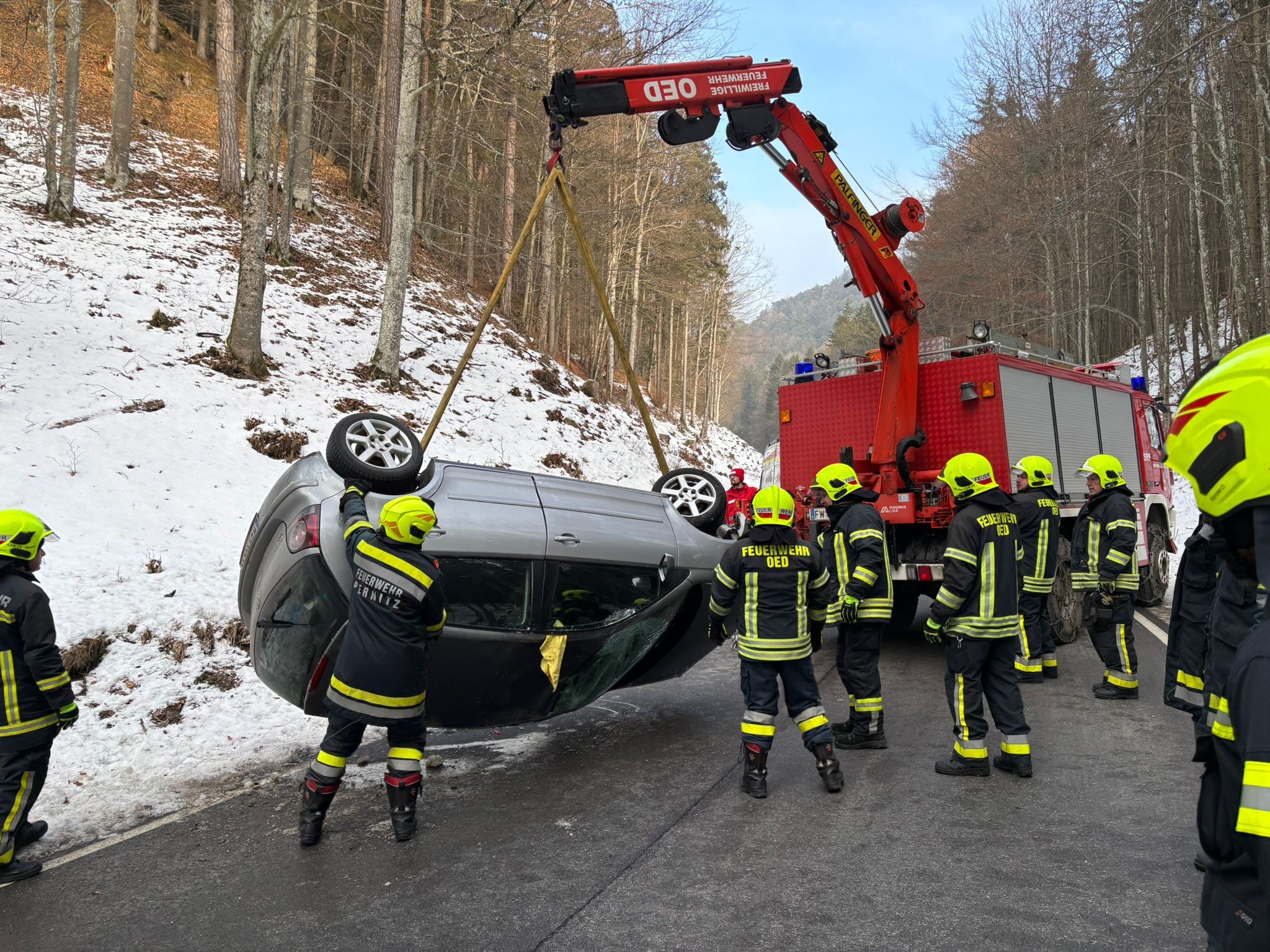 Am Freitag, dem 23. Jänner 2026, wurde die FF Pernitz um 13:35 Uhr zu einem Verkehrsunfall mit unklarer Lage auf der L138 (Halsstraße) im Bereich Schärfthal alarmiert. Ein PKW war aus bislang ungeklärter Ursache von der Fahrbahn abgekommen und kam in weiterer Folge auf dem Dach am Fahrbahnrand zum Stillstand.